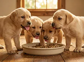 Rozpoczęliśmy dokarmianie! Szczeniaki próbują pierwszego pokarmu stałego – specjalna karma dla szczeniąt zmieszana z mlekiem. Bałagan jest ogromny, ale entuzjazm jeszcze większy!