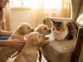 Intensywny program socjalizacji w pełni! Szczeniaki poznają różne powierzchnie, dźwięki (odkurzacz, suszarka, muzyka), a także spotkały naszego domowego kota. Wszystko pod kontrolą i z dużą dawką pozytywnych doświadczeń.
